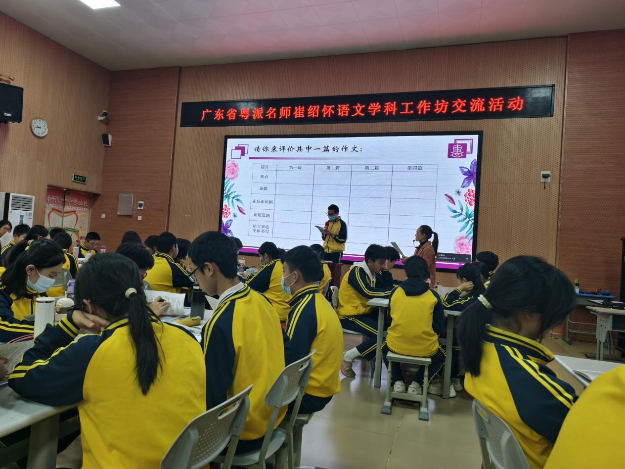 广东省粤派名师崔绍怀语文学科工作坊的成员曾小玲老师执教了一节《一分钟讲话训练在初中语文作文讲评中的应用》的作文讲评课。曾老师以学习金字塔理论为基础,设计了一节以学生为学习主体的展评课。课堂给学生搭起了议论文的赏析框架,让学生有更明确的评价切入点。惠州市惠南学校九(3)班的同学在课堂上充分发挥学习主体的积极性,积极上台分享自己对于议论文写作的赏析,从确立观点到材料的筛选再到论证思路的评析,每位同学先在小组展示自己的看法。最后由各组代表向全体师生展示自己的作文评析。